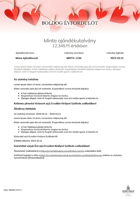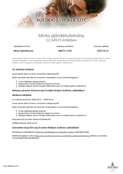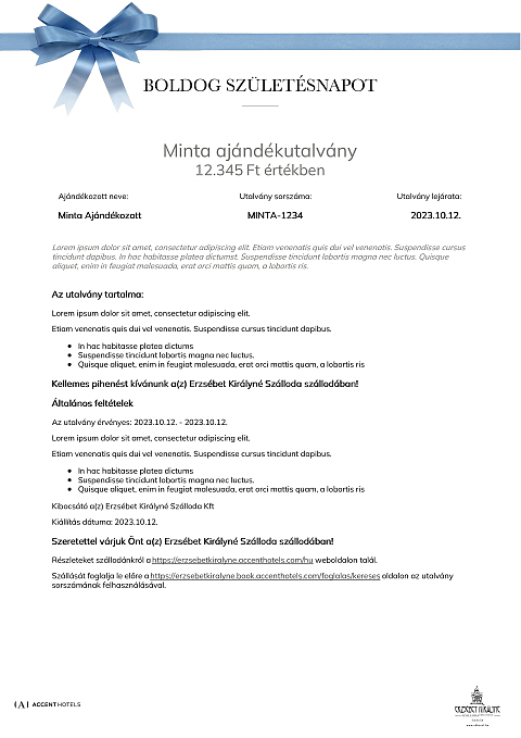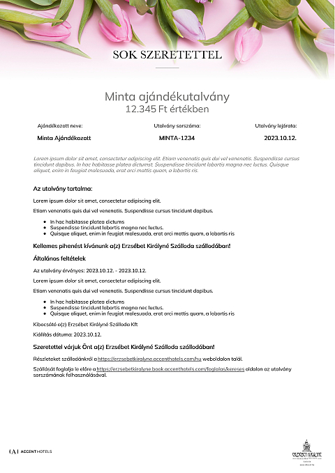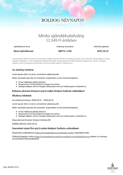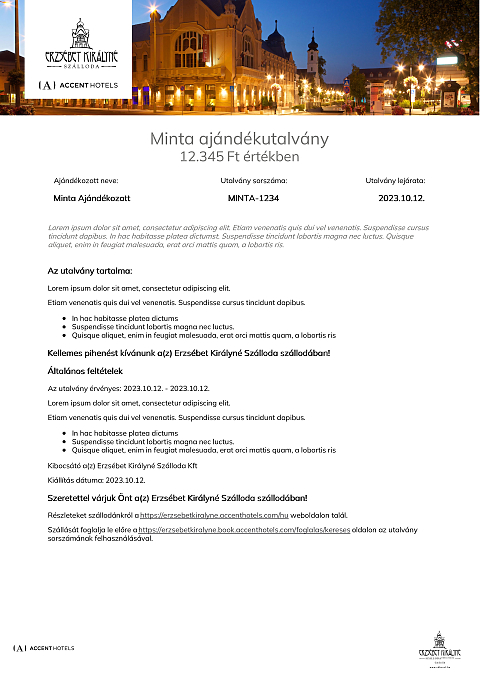 Az utalvány a(z) Erzsébet Királyné Szálloda szállodában váltható be minden olyan számla részben vagy egészében történő fizetésére, melyen legalább egy éjszaka szállás szolgáltatás is szerepel.